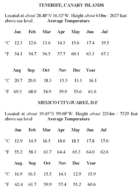 Their ships inside temperatures are kept at about 40 degrees. The following average temperature tables show that the temperatures are pleasant at three pyramid sites Mallorca, Tenerife, and Teotihuacan, just north of Mexico City.