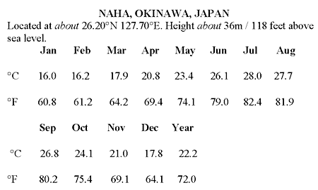 Additionally, there is a huge underwater pyramid complex and city at about 100-foot depth in the ocean off of Okinawa, Japan. The average temperatures at that location before it submerged would have been cooler than the capital city of Naha, Okinawa today (shown here as a reference) because it was on the coast in ancient times, and Naha is inland.