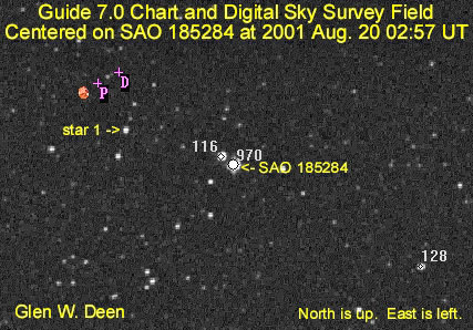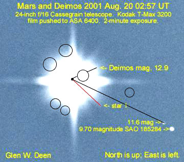 Now on to Glen’s article. In the first few paragraphs of Glen’s article, he states that he photographed Deimos on August 20th, 2001. He compares the photograph he took with a "Guide 7" chart of the same time period. We post both of these images here side by side for you to see. This finding is inconclusive at best. First of all, the images of what he calls "star 1" and "Deimos" are not distinct and could obviously be anomalies. We point out several other areas where these anomalies can be seen on his image (denoted by black circles).