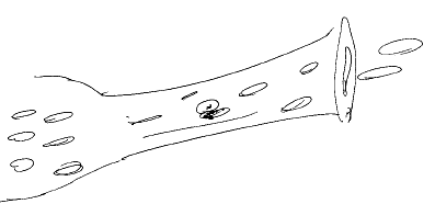 I then cue myself to move to the subspace activity that is at an optimal location for understanding the target activity. I sketch an oddly shaped object that resembles a flower vase turned on its side. There are elliptical or round objects inside this object. I deduct the idea of a wormhole. There is fast movement associated with transportation inside. I get the sense of being sucked through this object. It feels metallic and self-contained. I focus on one of the curved or elliptical objects inside the larger object, and I deduct the idea of a ship.